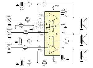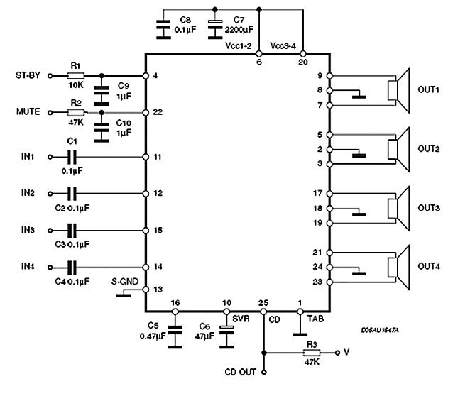 Scalone wzmacniacze mocy stosowane nie wymagają wielu elementów zewnętrznych. Na rysunku 3 pokazano schemat 4-kanałowego wzmacniacza o mocy 28 W na kanał przy obciążeniu 4 Ω z układem TDA7854 produkowanym przez firmę STMicroelectronics.