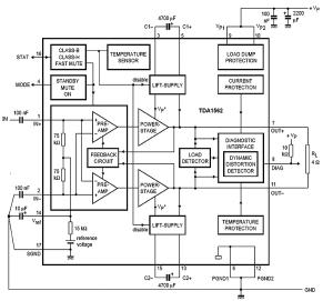 Za pomocą 3-poziomowego wejścia MODE można wybrać jeden z trzech trybów pracy wzmacniacza (standby - poziom niski, mute - poziom średni, normalna praca - poziom wysoki). Układ TDA1562 można przełączać za pomocą wejścia STAT do pracy tylko w klasie AB lub w pełnej klasie H (poziom niski - układ wyciszony, średni - klasa AB, wysoki - klasa H).