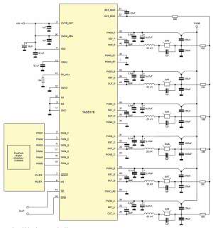 Wzmacniacz pracuje w systemie Pure Path Digital, nie ma wejść analogowych i wymaga dodatkowego procesora sterującego sygnałami PWM. Schemat aplikacyjny układu pokazano na rysunku 6. Producent deklaruje sprawność wzmacniacza z układem TAS5176 wynoszącą co najmniej 90%. Również parametry podawane w karcie katalogowej są bardzo dobre.