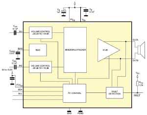Na rysunku 7 pokazano schemat blokowy układu LM48100Q z rodziny Boomer, ze wzmacniaczem mocy w układzie mostkowym BTL. Układ jest monofoniczny i ma dwa przełączane wejścia. Każde z nich ma osobny regulator poziomu sygnału zmieniający go w zakresie -80...+18 dB w 32 krokach. Blok mikser/multiplekser spełnia rolę selektora wejść i miksera.