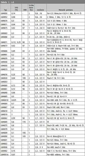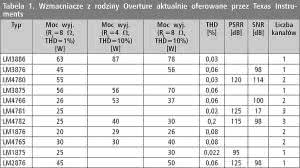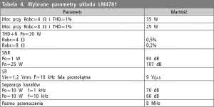 Układy te charakteryzują się bardzo dobrymi parametrami i dużą mocą wyjściową. Wybrane parametry układu LM4781 pokazano w tabeli 4, a typową aplikację na rysunku 5. Układ LM4782 ma nieco mniejszą moc i nieznacznie gorsze parametry elektryczne.