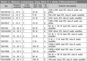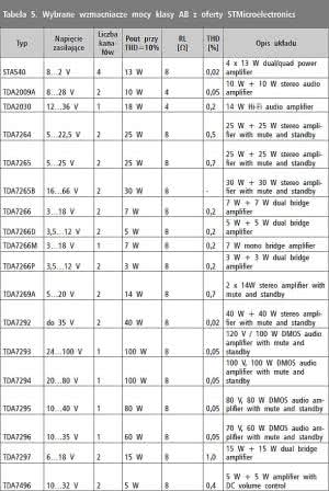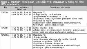 W tabeli 2 wymieniono przykładowe wzmacniacze scalone przeznaczone do zastosowania w sprzęcie car audio. Oferta firmy STM jest bardzo obszerna. Podobnie jak opisywany wcześniej układ TDA7294, scalone wzmacniacze tej firmy mają tranzystory mocy wykonane technologii MOS.