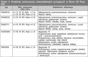 Ważnym producentem scalonych wzmacniaczy mocy przeznaczonych do zastosowania w pojazdach jest firma NXP. W tabeli 3 umieszczono przykładowe układy scalone wzmacniaczy pracujących w klasie AB. Moc podana w tej tabeli jest mocą sygnału użytecznego dla zniekształceń THD=10%, przy napięcia zasilania +14,4 V.