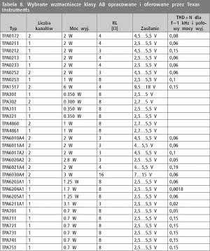 Po przejęciu National Semiconductor firma Texas Instruments nadal oferuje wzmacniacze z rodziny Boomer (tabela 7). W ofercie TI można też znaleźć wcześniejsze układy typu LM z rodziny Boomer opracowanej przez National Semiconductor, układy wzmacniaczy klasy AB zaprojektowane przez TI (tabela 8), jak również wzmacniacze klasy D opracowane przez Texas Instruments (tabela 9).