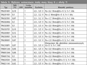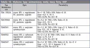Wzmacniacze małej mocy produkuje też firma NXP. Wybrane ich typy wraz z podstawowymi parametrami wymieniono w tabeli 10. Układy te różnią się pomiędzy sobą. Można wśród nich znaleźć różne rozwiązania: od najprostszego, monofonicznego, produkowanego już wiele lat (od 1994 r.) TDA7052A do najbardziej rozbudowanego TDA8552. Ten ostatni układ topologicznie prawie nie różni się od konkurencyjnego, opisywanego wyżej, TPA6021A4 firmy Texas Instruments.