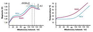 Rysunek 12 pokazuje przebieg zmian napięcia i temperatury akumulatorów NiCd i NiMH podczas ekspresowego ładowania dużym prądem 1C. Dla obydwóch typów, gdy akumulator jest bliski pełnego naładowania, charakterystyczne są dwa zjawiska:
