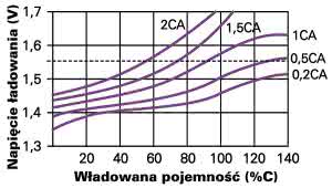 Wykresy dotyczą NiCd, ale analogiczne charakterystyki NiMH są podobne. Widać tu silną zależność od temperatury, a przy temperaturze akumulatora +40°C napięcie w końcowej fazie ładowania praktycznie nie zmienia się.