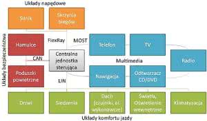 Główne interfejsy komunikacyjne to LIN, CAN, FlexRay oraz MOST. Różnią się one znacznie od siebie pod wieloma względami, dzięki czemu każdy z nich znajduje zastosowanie w innym obszarze systemów elektronicznych pojazdu. Przykładową architekturę sieci motoryzacyjnej wykorzystującej interfejsy LIN, CAN, FlexRay oraz MOST pokazano na rysunku 1.