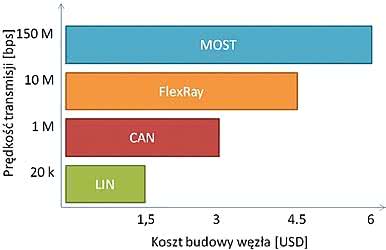 Wysoka prędkość transmisji danych jest parametrem pożądanym w wielu systemach motoryzacyjnych. Należy jednak pamiętać, że wraz ze wzrostem tej prędkości, a tym samym koniecznością stosowania odpowiedniego interfejsu komunikacyjnego, rośnie koszt budowy urządzenia wysyłającego i odbierającego informacje (tak zwany węzeł komunikacyjny). Najtańszy w realizacji jest węzeł z komunikacją LIN. Około dwukrotnie droższy jest węzeł CAN, a ponad dwukrotnie węzeł FlexRay. Koszt jednego węzła MOST jest około czterokrotnie wyższy niż węzła LIN. Odpowiednie zestawienie porównujące prędkość transmisji i koszt realizacji węzła z danym interfejsem komunikacyjnym pokazano na rysunku 2.