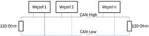 Do przesyłania informacji przez magistralę CAN służą dwie linie sygnałowe: CAN High (CANH) oraz CAN Low (CANL). Na obu końcach magistrali linie te połączone są rezystorem terminującym o oporności 120 Ohm, co zapewnia niewrażliwość magistrali na odbicia sygnału. Schemat sieci CAN przedstawiono na rysunku 3.