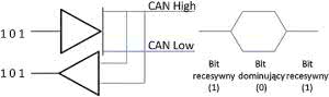Informacje przesyłane są przez magistralę CAN metodą różnicową. Oznacza to, że stany sygnału określane są przy pomocy różnicy napięcia między liniami CAN High oraz CAN Low. Możliwe są dwa stany: recesywny, reprezentujący logiczną jedynkę oraz dominujący, reprezentujący logiczne zero (rysunek 5). Stan recesywny wystąpi, gdy napięcie na obu liniach magistrali CAN będzie równe i wyniesie 2,5 V, a więc różnica napięć będzie równa 0 V. Stan dominujący wystąpi, gdy napięcie na linii CAN High wyniesie 3,5 V, natomiast na linii CAN Low 1,5 V, a więc różnica napięć będzie równa 2 V.