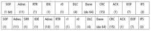 Specyfikacja CAN wyróżnia dwa formaty ramek data frame: podstawowy (wersja CAN 2.0A) oraz rozszerzony (CAN 2.0B). Strukturę obu ramek pokazano na rysunku 6. Warianty te różnią się głównie długością identyfikatora (adresu). Standard CAN 2.0A cechuje się adresem ramki o długości 11 bitów, natomiast w standardzie CAN 2.0B adres zawiera 29 bitów. Oprócz adresu, ramka CAN zawiera następujące pola: