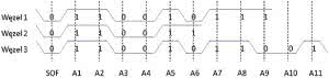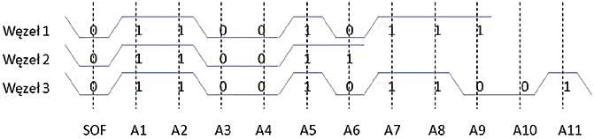 Aby zobrazować jak działa mechanizm CSMA/CR, warto rozważyć przykładowy scenariusz, zilustrowany na rysunku 7. Trzy węzły (oznaczone kolejno numerem 1, 2 i 3) chcą wysłać wiadomość na magistralę. Po upewnieniu się, że dotychczas trwająca na magistrali transmisja została zakończona, rozpoczynają nadawanie w tym samym momencie czasu. Pierwszym wysłanym bitem jest bit początku wiadomości (SOF). Po nim wysyłane są bity adresu. Każdy z węzłów po nadaniu kolejnego bitu adresu sprawdza poziom sygnału ustawiony na magistrali. Dopóki wszystkie węzły wysyłają bity o takiej samej wartości, odczytują adekwatny do nich stan sygnału magistrali. Dzieje się tak dla bitów adresu o indeksie od 1 do 5 włącznie. Bit numer 6 nie jest już taki sam dla wszystkich węzłów. Węzły 1 i 3 wysyłają bit 0 (dominujący), natomiast węzeł 2 wysyła bit 1 (recesywny). Na magistrali ustawiony zostaje bit dominujący, który zawsze wygrywa z bitem recesywnym. Węzeł 2 odczytuje inny stan na magistrali niż stan wynikający z wysłanego bitu. Jest to dla niego informacja, że inny węzeł jednocześnie wysyła wiadomość i ma ona wyższy priorytet. W wyniku tego faktu węzeł 2 nie kontynuuje wysyłania wiadomości. Wysyłanie wiadomości kontynuują natomiast węzły 1 i 3. Nadane zostają kolejne bity adresu o indeksie 7 i 8. Bit numer 9 ponownie nie ma takiej samej wartości w przypadku obu węzłów. Węzeł numer 3 wysyła bit 0, natomiast węzeł 1 bit 1. Na magistrali ustawiony zostaje bit dominujący 0. Węzeł 1 zauważa różnicę wartości wysłanego bitu i stanu magistrali, więc zaprzestaje dalszej transmisji. Węzeł 3 kontynuuje wysyłanie adresu i dalej kolejnych pól ramki CAN.
