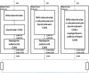 - Koncepcja nr 3 (jeden układ scalony): mikrokontroler z wbudowanym kontrolerem CAN i wbudowanym nadajnikiem-odbiornikiem CAN