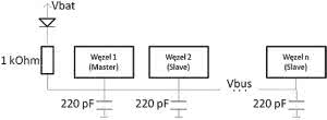 Interfejs LIN - warstwa fizyczna. Urządzenia przy pomocy interfejsu LIN mogą stworzyć sieć o topologii magistrali. Do przesyłania informacji wykorzystywana jest jedna linia sygnałowa (Vbus), która przy układzie Master podłączona jest przez diodę i rezystor (typowo 1 kOhm) do napięcia Vbat o wartości od 8 do 18 V (typowo 12 V). Dodatkowo przy każdym węźle linia Vbus powinna być połączona przez kondensator (typowo 220 pF) z masą. Schemat sieci LIN przedstawiono na rysunku 9.
