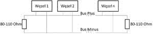 Medium transmisyjnym dla interfejsu FlexRay są dwie linie sygnałowe: Bus Plus (BP) i Bus Minus (BM). Każdy węzeł sieci musi być dołączony do obu tych linii. Na końcach medium transmisyjnego linie BP i BM połączone są rezystorem o wartości 80 - 110 Ohm, co zapobiega odbiciom sygnału. Schemat sieci CAN przedstawiono na rysunku 12.