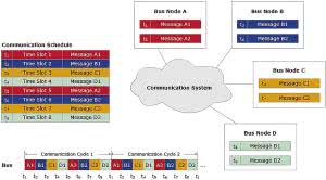 FlexRay to rozwiązanie, w którym komunikacja synchronizowana jest za pomocą mechanizmu wyzwalania czasem (time-triggered communication). Uzyskano go dzięki zastosowaniu metody dostępu do medium o nazwie TDMA (Time Division Multiple Access). Zgodnie z zasadami TDMA, węzeł sieci nie może w zupełnie dowolnym momencie rozpocząć transmisji danych. Może to uczynić tylko w przyporządkowanym mu przez system czasie. Każdy z węzłów sieci dysponuje swoją indywidualną szczeliną czasową. Schemat tak zaimplementowanej komunikacji zobrazowano na rysunku 13.