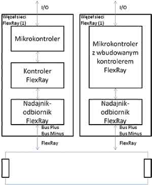 - Koncepcja nr 2 (dwa układy scalone): mikrokontroler z wbudowanym kontrolerem FlexRay i zewnętrznym nadajnikiem-odbiornikiem FlexRay