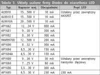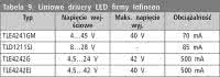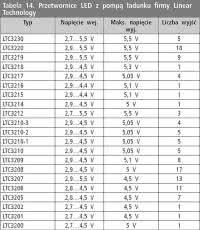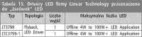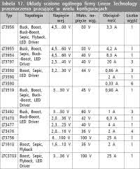 Linear Technology. Ten producent jest dobrze znany z wytwarzania układów przeznaczonych do budowania zasilaczy o różnym przeznaczeniu. Dlatego też w jego ofercie nie mogło zabraknąć układów do zasilania LED. W tabelach 11...17 umieszczono skrócony przegląd oferty LT.