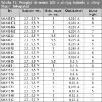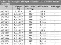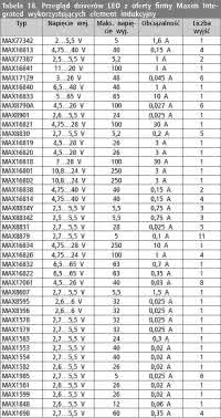 Maxim Integrated. Układy scalone przeznaczone do zasilania diod LED z oferty firmy Maxim Integrated wymieniono w tabelach 18...20. Oferta tego producenta obejmuje szereg układów pracujących w różnych topologiach, o obciążalności od dziesiątek miliamperów do kilkudziesięciu amper.