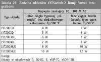 <p>Układy z rodziny LYTSwitch-2 (tab. 23) są przeznaczone do zasilania diod LED o mocy do 10 W. Dzięki mechanizmowi regulacji po stronie pierwotnej, wyeliminowano konieczność użycia transoptora w pętli sprzężenia zwrotnego osiągając przy tym dobrą dokładność stabilizacji prądu wyjściowego (±3%).</p>