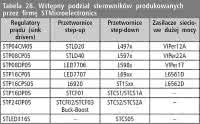 <p><strong>STMicroelectronics</strong>. Firma oferuje ogromną liczbę produktów, między innymi układy przeznaczone do zasilaczy LED oraz ogromną liczbę półprzewodnikowych komponentów dyskretnych do budowania źródeł zasilania. Przetwornice oferowane przez STMicroelectronics mogą pracować w konfiguracjach: flyback, boost, buck, LLC resonant, buck-boost. Tabela 28 zawiera wstępny podział sterowników wprowadzony przez firmę STMicroelectronics. W dalszych tabelach podzielimy je bardziej szczegółowo, wskazując konkretne aplikacje.</p>