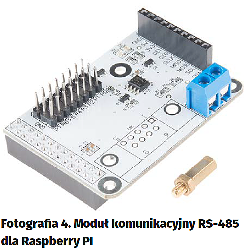 RS485 Jeśli RS-232 to za mało, można poszukać modułu RS-485. Dobrym przykładem jest przedstawiony na fotografii 4 model DEV-13706, który można nabyć za około 80 zł. Trzeba jednak wziąć pod uwagę, że nie ma on wyprowadzonego mechanicznego portu, używanego typowo w urządzeniach z RS-485. W razie potrzeby można go samodzielnie dolutować, a w przeciwnym razie połączeń z interfejsem należy dokonywać za pomocą goldpinów.