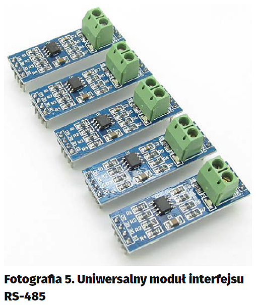 Tańszym rozwiązaniem będzie użycie jednego z uniwersalnych modułów RS-485, opartych na układzie MAX-485, takich jak na fotografii 5. Można je nabyć już za około 10 zł.
