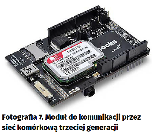 Raspberry PI świetnie nadaje się do tworzenia małych, zdalnych systemów, umieszczonych w trudno dostępnych lokalizacjach. Wtedy dobrym sposobem komunikacji z otoczeniem jest użycie interfejsu GSM. Tanie moduły tego typu, korzystające z sieci 2G i GPRS (fotografia 6), można nabyć już za około 250...260 zł. Jeśli konieczna jest szybsza transmisja, można poszukać modułu 3G, czego dobrym przykładem jest płytka z fotografii 7. Niestety koszt takiego rozwiązania znacznie rośnie. Przedstawiony moduł kosztuje niecałe 700 zł.