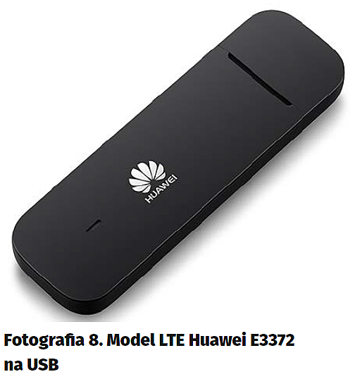 Znacznie tańszym, ale mniej eleganckim rozwiązaniem będzie użycie modemu na USB. Co więcej, daje to możliwość skorzystania z sieci LTE. Raspberry PI poprawnie działa m.in. z modemem Huawei E3372 (fotografia 8), z tym że rozwiązanie to zajmuje dodatkowy port USB i mocno wystaje poza obrys samego komputera. Trzeba też pamiętać, że komunikacja przez sieć komórkową wiąże się z chwilowymi, dużymi poborami prądu. Należy się upewnić, że zasilacz Raspberry PI jest wystarczająco wydajny oraz że używana wersja RPI pozwala na dostarczenie wystarczającego prądu na złącza USB. Niekiedy rozwiązaniem tego problemu jest dołączenie drugiego zasilacza za pomocą odpowiedniego rozdzielacza, bezpośrednio do modemu USB. Niestety, to bardzo nieeleganckie rozwiązanie, które może powodować problemy z działaniem całego komputera.