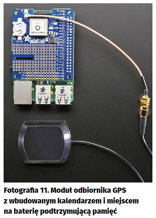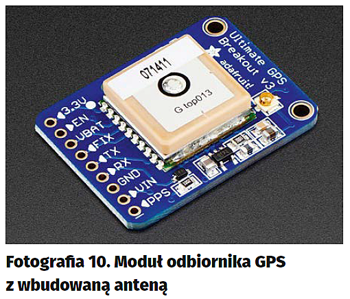 Moduły GSM są często doposażone w odbiornik GPS, a czasem nawet GPS/GLONASS. Dobrym przykładem jest przedstawiony na fotografii 9 produkt z modułem SIM908 firmy SIMcom. Jego cena to ok. 400…450 zł. Jeśli potrzebny jest tylko GPS, a koszty są bardzo istotne, tańszym rozwiązaniem będzie użycie odbiornika bez funkcji komunikacji komórkowej, takiego jak produkowany przez firmę Adafruit (fotografia 10). Bazuje on na układzie MTK3339 i ma wbudowaną antenę, a jego koszt to ok. 200 zł. Nieco bardziej zaawansowaną wersją będzie inny moduł GSM firmy Adafruit, wyposażony dodatkowo w zegar czasu rzeczywistego oraz miejsce na baterię podtrzymującą pamięć tego zegara. Moduł ten (fotografia 11) jest trochę droższy i większy.