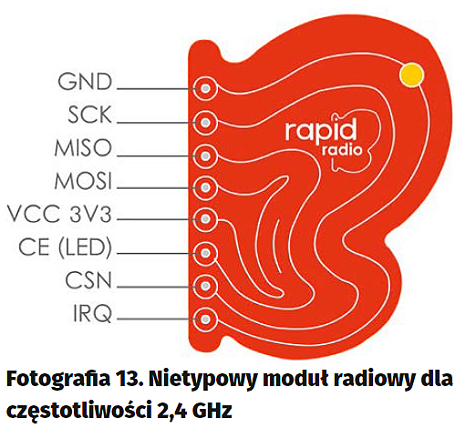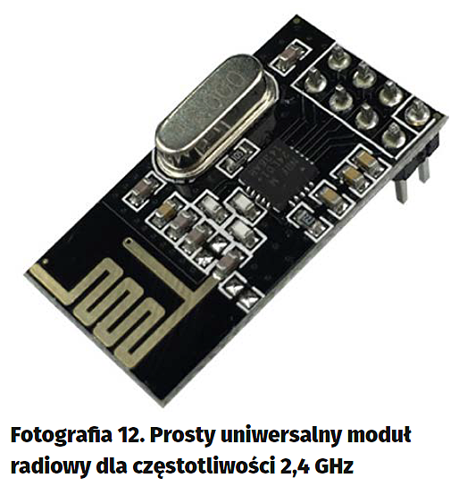 Komunikację radiową na krótsze odległości można realizować za pomocą modułów pracujących w paśmie ISM. Prosty uniwersalny moduł radiowy (fotografia 12) dla częstotliwości 2,4 GHz można nabyć już za 8 złotych. Najczęściej bazują one na układzie nRF24L01, a komunikacja z nimi przebiega poprzez interfejs SPI. Podzespół ten będzie pasował nie tylko do RPI, ale do wszelkich komputerów z interfejsem SPI. Jako ciekawostkę można podać m.in. alternatywny moduł tego samego typu, który kształtem przypomina skrzydło motyla (fotografia 13). Bazuje on na układzie RFM75, a jego deklarowany, maksymalny zasięg transmisji to ok. 70 m. Cena wynosi niecałe 30 zł.