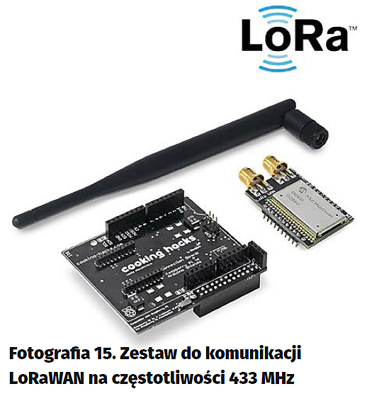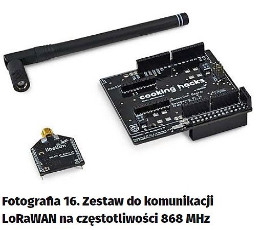Oprócz uniwersalnych modułów radiowych, na rynku znaleźć można też układy z zaimplementowaną obsługą konkretnych protokołów komunikacyjnych, takich jak np. LoRaWAN. Mogą one działać na częstotliwości 433 MHz lub 868 MHz. Często mają postać modułów kompatybilnych z XBee, ale dostarczane są wraz z przejściówką, która pozwala na wygodne podłączenie ich do Raspberry PI. Zestawy tego typu kosztują ok. 400...450 zł. Zestaw dla częstotliwości 433 MHz pokazano na fotografii 15, a dla 868 MHz na fotografii 16. Ich zaletą jest duży zasięg transmisji.