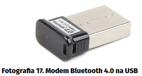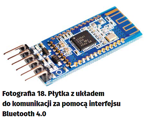 Jeśli wymagany zasięg komunikacji jest znacznie mniejszy, można pomyśleć o komunikacji radiowej przez Bluetooth. Jeśli nie mamy Raspberry PI 3, najłatwiej ją zrealizować z użyciem niedrogich modułów BT na USB (fotografia17). Koszt takiego modemu wynosi kilkanaście złotych, a jego rozmiary są na tyle nieduże, że nie sprawia problemu fakt, że wystają poza obudowę. Te najpowszechniej dostępne są oparte na układach firmy CSR – często zgodnych z BT 4.0 +LE, co ma znaczenie przy tworzeniu urządzeń typu Bluetooth Smart i Bluetooth Smart Ready. Niestety moduły te zajmują cenne gniazda USB i dlatego niekiedy korzystniejszym rozwiązaniem będzie użycie modułu w postaci płytki drukowanej, połączonej przez UART z GPIO Raspberry PI. Te pasują też do Arduino i dowolnych innych komputerów z UART-em. Najtańsze z nich (fotografia18) kosztują kilkanaście złotych i są oparte na układzie CC2540 lub CC2541 firmy Texas Instruments.