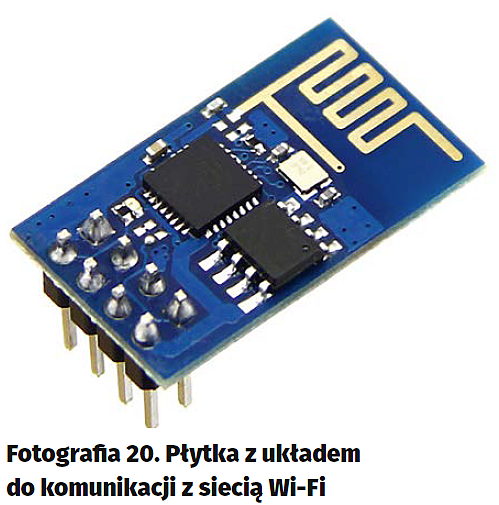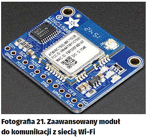 Podobnie wygląda kwestia interfejsów Wi-Fi. Jeśli obsługa 802.11n nie jest wbudowana, można podłączyć moduł w postaci miniaturowej karty na USB (fotografia 19) lub płytki komunikującej się przez UART (fotografia 20). Te pierwsze najczęściej bazują na którejś wersji układu RTL8188 i mają pojedynczą wbudowaną antenę, choć znaleźć można też modele z dwiema antenami, co teoretycznie pozwala na transmisję wielotorową do 300 Mb/s, zgodnie z IEEE802.11n. W praktyce jednak mało który sprzedawca jest w ogóle w stanie podać klientowi informacje na temat dokładnej odmiany układu RTL8188, zainstalowanego w module, co czasem skutkuje koniecznością ręcznego dobierania sterowników metodą prób i błędów. Natomiast tanie moduły w postaci płytek drukowanych są najczę?ciej oparte na?uk?adzie ESP8266 i?kompatybilne z?Arduino. Bardziej zaawansowanym i?znacznie dro?szym modu?em Wi-Fi dla Raspberry PI będzie model ATWINC1500 SPI/UART+ (ściej oparte na układzie ESP8266 i kompatybilne z Arduino. Bardziej zaawansowanym i znacznie droższym modułem Wi-Fi dla Raspberry PI będzie model ATWINC1500 SPI/UART+ (fotografia 21), opracowany przez Adafruit. Ma złącze antenowe u.FL oraz można się z nim komunikować m.in. przez protokół SPI. Obsługuje też przerwania. Koszt takiego modułu to ok. 130 zł.