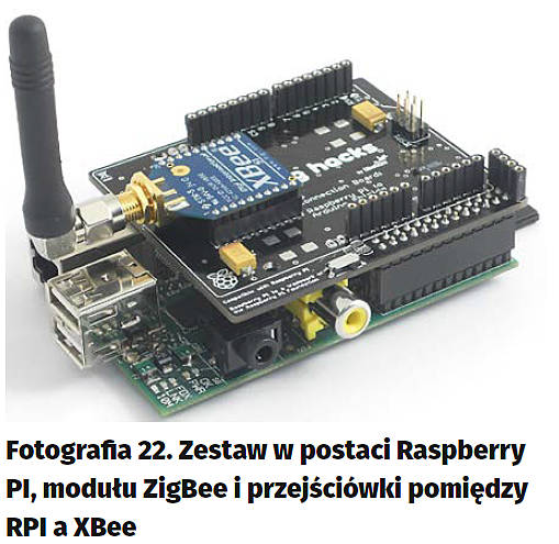 Pozostało jeszcze wspomnieć o komunikacji radiowej zgodnej z protokołem ZigBee. Moduły tego typu do Arduino są najczęściej produkowane w formacie XBee i kosztują niecałe 200 zł. Dostępne są do nich przejściówki dla Raspberry PI oraz biblioteki programistyczne. Zmontowany zestaw tego typu został pokazany na fotografii 22.