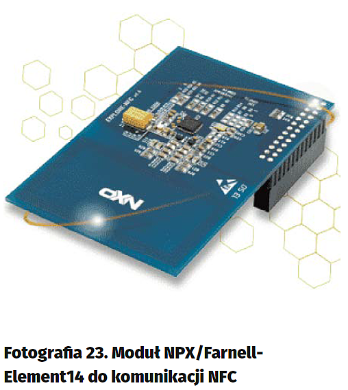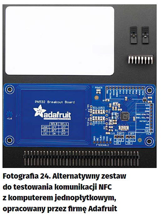 Do interfejsów radiowych należy także zaliczyć NFC, którego wykorzystanie w połączeniu z Raspberry PI może prowadzić do powstania bardzo ciekawych projektów. Moduł tego typu został opracowany m.in. przez Farnell Element14 we współpracy z NXP i bazuje na układzie PN512 (fotografia 23). Komunikuje się z komputerem za pomocą SPI lub I2C, przy czym dostępne obecnie sterowniki pozwalają jedynie na użycie SPI. Pozwala realizować czytniki, komunikację P2P oraz symulować działanie kart NFC. Jest też w pełni kompatybilny ze standardem kart RFID MIFARE Ultralight. Kosztuje ok. 90 zł, przy czym na rynku można znaleźć tańsze i droższe zamienniki z układem PN532 (fotografia 24).