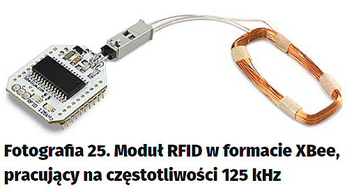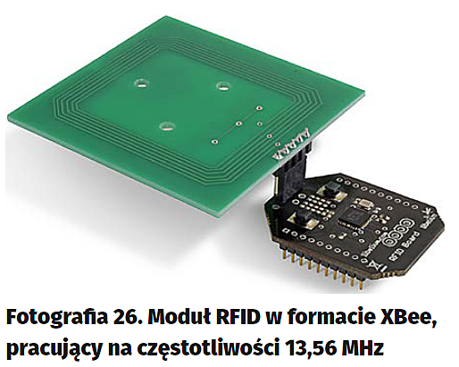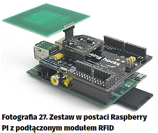 Wbrew pozorom, moduły RFID dla Raspberry PI wcale nie są tańsze. Najczęściej mają postać modułów XBee i wymagają przejściówki do podłączenia do RPI. Model pracujący ze znacznikami 125 kHz (fotografia 25) można kupić za około 180 zł, a odczytujący znaczniki 13,56 MHz (fotografia 26) za niecałe 250 zł + koszty przejściówki. Przykład zmontowanego zestawu z Raspberry Pi pokazano na fotografii 27.