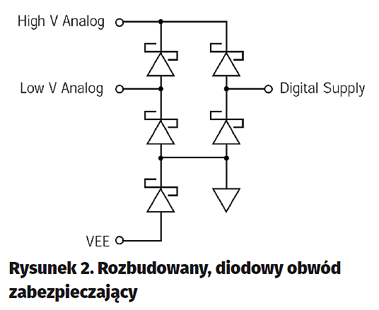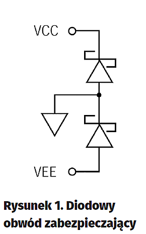 Systemy zasilane pojedynczym napięciem dodatnim i pojedynczym napięciem ujemnym mogą być łatwo zabezpieczone przed uszkodzeniem poprzez zastosowanie nieskomplikowanego obwodu zbudowanego z komponentów dyskretnych, pokazanego na rysunku 1. W jego budowie zastosowano diody Schottky włączone w obwód zasilania, który załączy się wcześniej, niż złącza krzemowe wewnątrz chronionego obwodu scalonego i dzięki temu będzie on przewodził znaczącą część prądu. Diody użyte w tym zabezpieczeniu muszą mieć niewielkie napięcie przewodzenia w najgorszym przypadku prądu zasilania. Na przykład, jeśli ten typ zabezpieczenia zastosowano do ochrony 8-wyjściowej karty I/O, w której każde wyprowadzenie może przewodzić prąd rzędu 200 mA, wówczas diody Schottky użyte w zabezpieczeniu muszą gwarantować napięcie progowe rzędu 0,5 V przy prądzie 1,6 A. W większości wypadków taki prąd nigdy nie popłynie, jednak stosowanie komponentów przewidzianych do pracy w najgorszych warunkach jest dobrą praktyką konstruktorską i daje margines bezpieczeństwa.