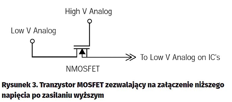 W celu uzyskania poprawnej sekwencji można posłużyć się obwodem zbudowanym z diod Schottky, pokazanym na rysunku 2. Nie zastąpi on wyspecjalizowanego układu scalonego, ale na pewno jest tani i łatwy w budowie. Prąd przewodzenia diod i ich napięcie progowe powinny być dobrane zgodnie z regułą „najgorszego przypadku”. W niektórych zastosowaniach, zwłaszcza przy ograniczonej wydajności prądowej źródła niższego napięcia, można użyć tranzystora MOSFET włączonego jak na rysunku 3. Prezentowany obwód – włączony w szereg z wejściem zasilania – może być stosowany do zabezpieczenia przed sytuacją, w której niże napięcie wystąpi przed wyższym. Aby układ pracował poprawnie, rezystancja przewodzenia tranzystora MOSFET RDS(on) musi być wystarczająco niska przy napięciu UGS występującym pomiędzy niskonapięciową i wysokonapięciową częścią obwodu i przy maksymalnym prądzie, który popłynie przez kanał tranzystora. Jeśli różnica napięcia pomiędzy drenem a źródłem nie jest zbyt wysoka, to należy użyć tranzystora o niskim napięciu bramki.