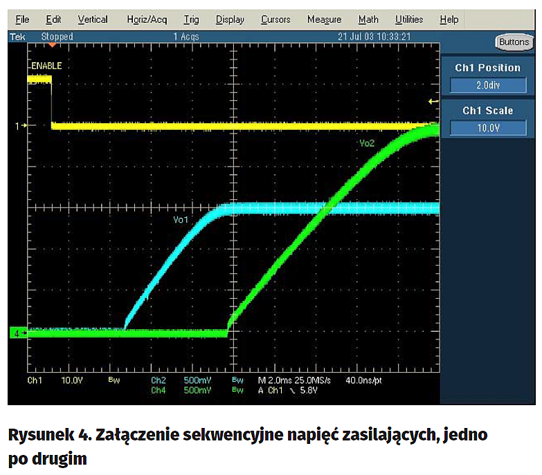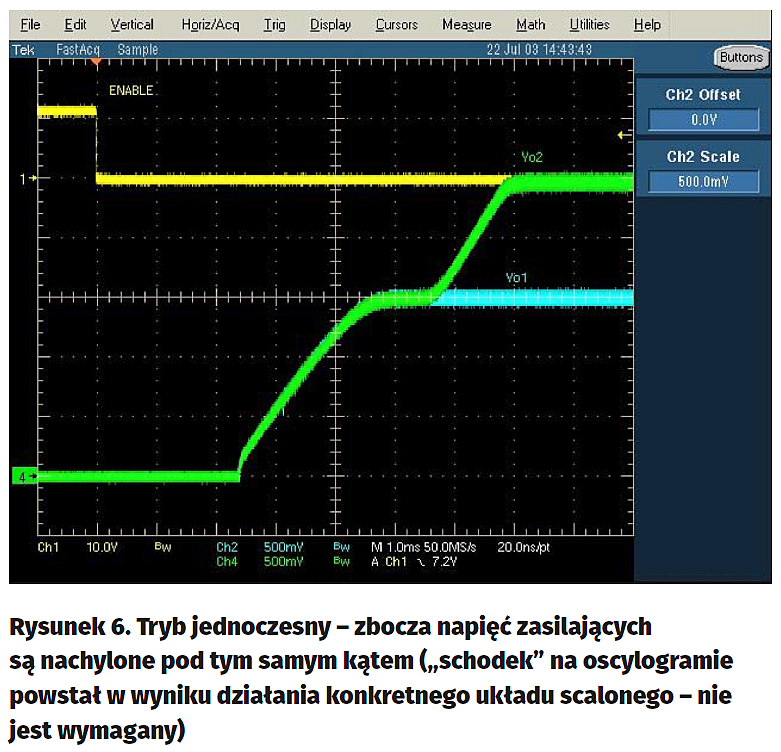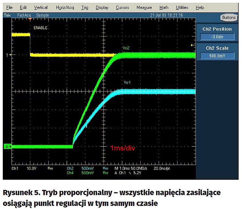 2) Proporcjonalną (ratiometric), gdy wszystkie napięcia zasilające osiągają wartość znamionową w tym samym czasie (rysunek 5). Zbocza napięć pokazane na oscylogramie mają różne czasy narastania, aby punkt regulacji został osiągnięty w przybliżeniu w tym samym czasie. Po wyłączeniu napięcia głównego zbocza opadające obu napięć mają różne nachylenia, aby napięcia zasilające osiągnęły poziom masy w przybliżeniu w tym samym czasie.