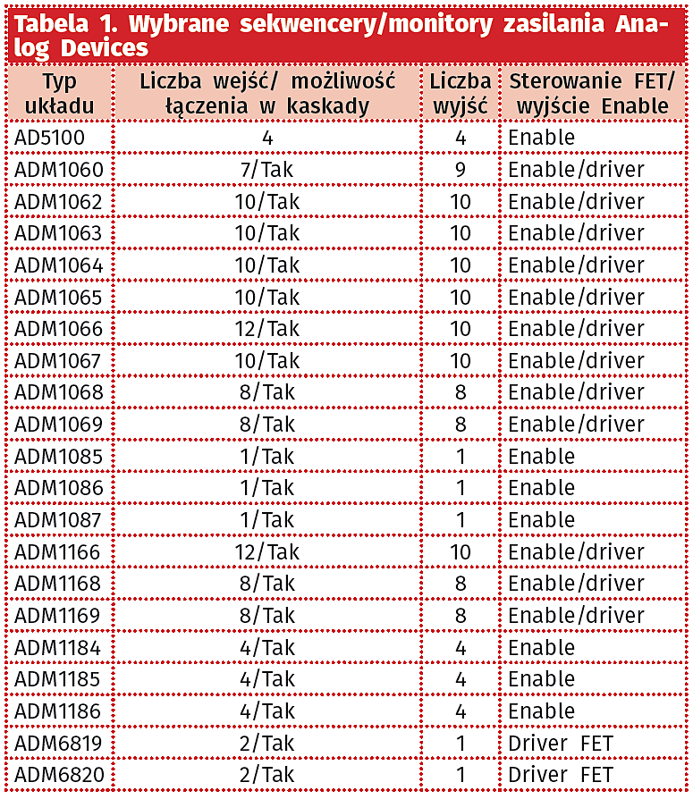 Firma Analog Devices wytwarza dwa rodzaje układów sekwencjonujących zasilanie – analogowe i cyfrowe (tabela 1) różniące się zasadą działania. W budowie pierwszych zastosowano komparatory i funkcjonujące w oparciu o nie układy czasowe, natomiast w drugich przetworniki A/C oraz bloki cyfrowe.