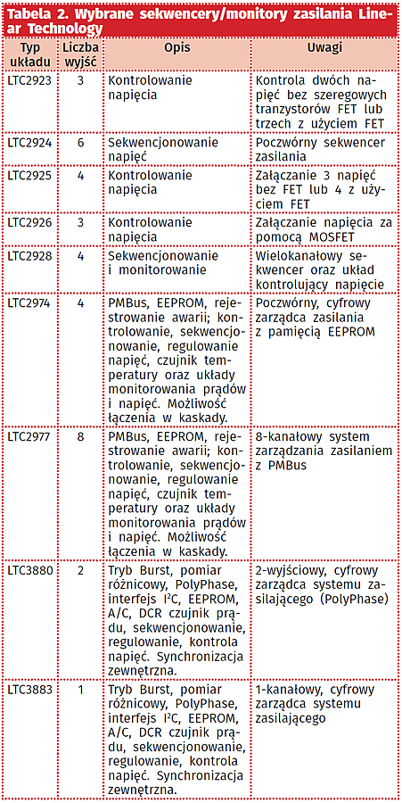 Ofertę Linear Technology zdecydowaliśmy się opisać zaprezentować tuż po Analog Devices, ponieważ firma Analog Devices kupiła LT. Zapewne – jak w wypadku zakupu National Semiconductors przez Texas Instruments – oferta LT zostanie „wchłonięta” przez AD, co może spowodować zastąpienie jednych układów drugimi, opracowanie nowych wersji i inne działania. Skrócony wykazem sekwencerów zasilania firmy LT umieszczono w tabeli 2.
