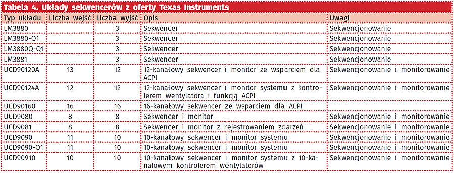 Firma Texas Instruments oferuje ogromną liczbę układów przeznaczonych do systemów zasilania. W ostatnich latach oferta tego producenta znacznie powiększyła się na skutek zakupu innych firm. Wybrane układy z oferty Texas Instruments zawiera tabela 4.