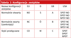 Zwykle stosuje się przekaźniki o zestykach normalnie otwartych (NO) lub normalnie zamkniętych (NC), jednak w niektórych zastosowaniach mogą być wymagane zestyki przełączane (CO). Oznaczenia konfiguracji zestyków umieszczono w tabeli 3. Stosowany powszechnie w Europie standard EN50005 zaleca stosowanie następującej numeracji dla doprowadzeń przekaźników: