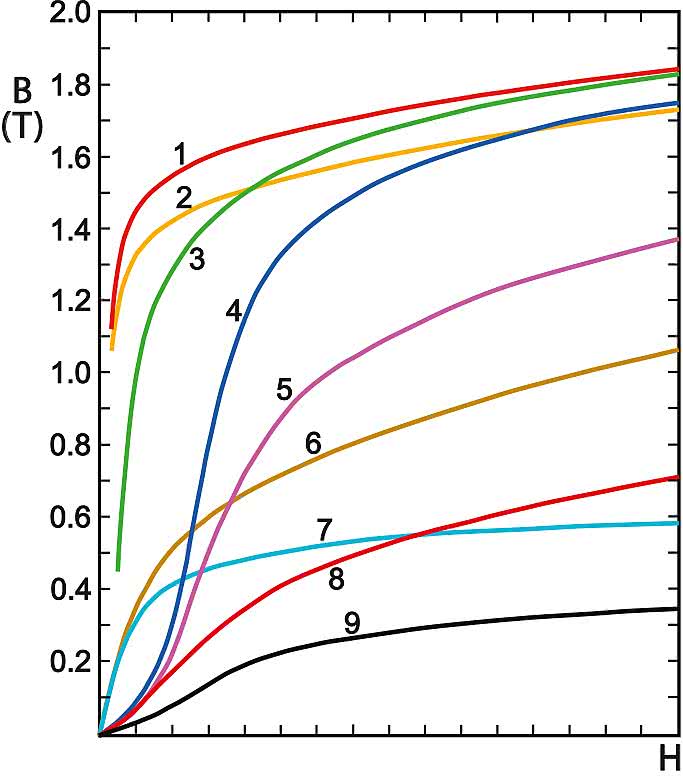Co ciekawe, indukcja nasycenia jest duża, jedna z największych, dla popularnego żelaza, ponad 1,5 tesli, natomiast dla rdzeni ferrytowych jest dużo mniejsza, rzędu 0,2...0,4 tesli. Rysunek 2 pokazuje krzywe magnesowania pierwotnego różnych materiałów, w tym kilku odmian stali (1, 2, 3, 4, 5), lanego żelaza (6) a także niklu (7), kobaltu (8) i magnetytu (9). Niezaznaczone tu krzywe magnesowania ferrytów przebiegałyby podobnie, jak trzy najniższe krzywe (7…9).