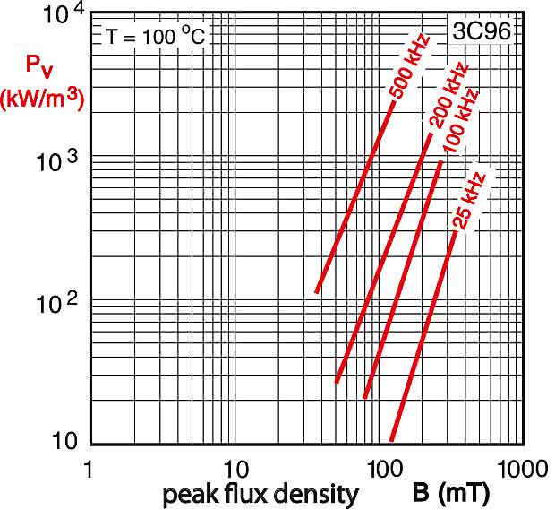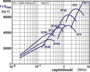 Podobnie jest z różnymi rodzajami ferrytów i innych materiałów: straty zawsze rosną ze wzrostem częstotliwości. Każdy materiał ferromagnetyczny ma określone straty przy danej częstotliwości i określonej indukcji. Rysunek 4 pokazuje zależność strat od częstotliwości i szczytowego namagnesowania (indukcji) dla pewnego ferrytu.