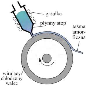 Jednym ze sposobów otrzymywania takich metalicznych szkieł jest natryskiwanie cieniutkiej warstewki ciekłego stopu na wirujący chłodzony bęben, często w atmosferze jakiegoś obojętnego gazu (rysunek 6).