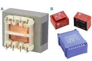 Zanim jednak przejdziemy do transformatorów planarnych przypomnijmy, że dawniej do realizacji transformatorów i dławików m.cz. wykorzystywano rdzenie kształtkowe (fotografia 7a). Najpierw bez kłopotu nawijano na karkasie uzwojenie(-a), potem pracowicie (i nie bez kłopotów) składano rdzeń z pojedynczych blaszanych kształtek EI lub M. Takie rozwiązanie było stosunkowo nieskomplikowane technologicznie, jednak miało też istotne wady. Transformatory o takiej konstrukcji są stale dostępne, zwłaszcza w wersjach zalewanych tworzywem sztucznym (fotografia 7b).