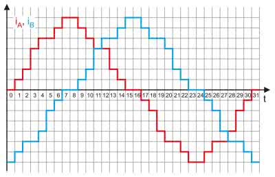 Sterowanie półkrokowe rozwiązało problem rozdzielczości i drgań silnika krokowego, ale nadal efekt nie był idealny. Sama nazwa - silnik krokowy, może sugerować, że kąty obrotu rotora są zawarte tylko w pewnym ograniczonym zbiorze wartości wynikających z budowy wewnętrznej silnika i metodzie cyfrowego poniekąd sterowania. Mówiąc o cyfrowym sterowaniu, mamy na myśli fakt, że dane uzwojenie przyjmuje w trakcie pracy tylko dwa stany: może być włączone albo wyłączone. W tej sytuacji jedyną metodą poprawiania rozdzielczości jest zwiększanie liczby uzwojeń, co z czysto mechanicznych względów jest mocno ograniczone. No dobrze, ale strumień magnetyczny wytwarzany w rdzeniu cewki jest proporcjonalny do natężenia prądu płynącego w uzwojeniach. Odpowiednio sterując tym strumieniem, można więc uzyskać pośrednie położenia rotora. To jest właśnie idea sterowania mikrokrokowego. Nie zapomnijmy jednak o tym, że mamy do czynienia z silnikiem krokowym, a więc sterownik powinien mieć w każdej chwili pełną kontrolę nad nim. Musi mieć możliwość zatrzymania silnika w określonym położeniu. Jeśli rotor ma być ustawiany w pozycjach pośrednich między pełnymi krokami, konieczne będzie generowanie odpowiednio dobranych dla tego ustawienia napięć zasilających uzwojenia silnika. Nawet bez głębszej analizy można przypuszczać, że równomierny obrót rotora uzyska się dla przesuniętych o 90° przebiegów sinusoidalnych. Sterownik silnika krokowego generuje jednak z definicji napięcia o wartościach dyskretnych.